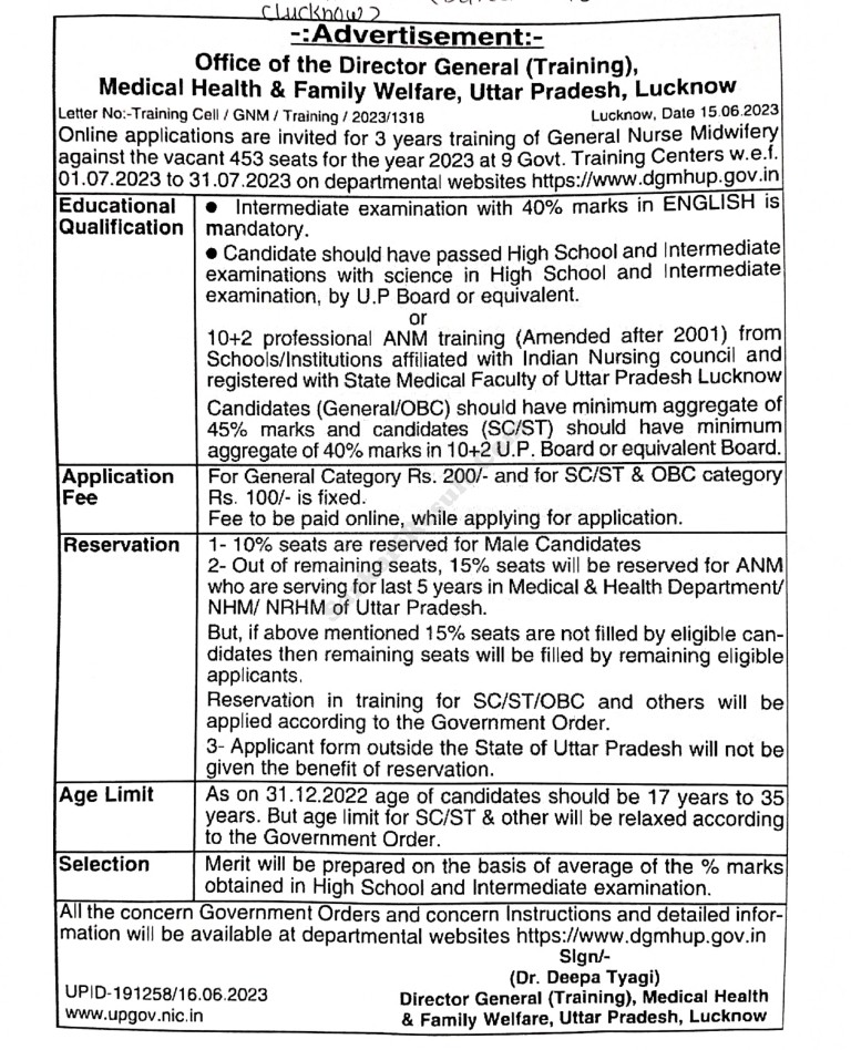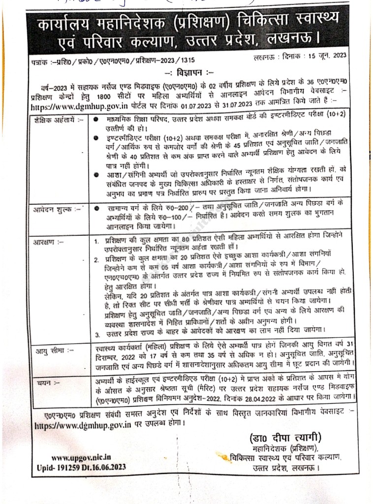 Uttar Pradesh Department of Medical Health & Family Welfare has released the online application form for admission ANM and GNM Training Courses 2023. Any student who wants to take admission in any college authorized by DGMHUP can apply online application from 01 July 2023 to 31 July 2023.